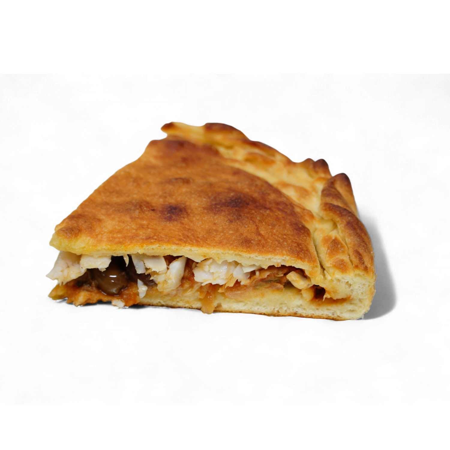 Una vera e propria focaccia ripiena che racchiude tutto il gusto del mare e della terra pugliese: merluzzo dell'Adriatico, cipolla stufata lentamente, olive leccine denocciolate.