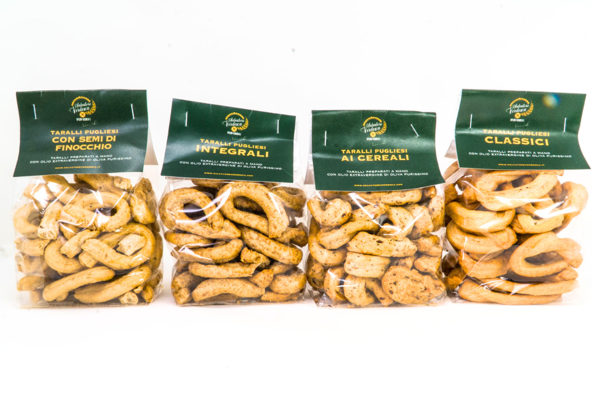 I taralli di Salvatore Verdesca nascono in un piccolo forno a Molfetta e sono sfornati in piccoli lotti. In questo modo garantiamo sempre la massima freschezza. Ogni ordine viene preparato artigianalmente e spedito appena sfornato, così da farti arrivare un prodotto sempre fragrante, come appena uscito dal forno