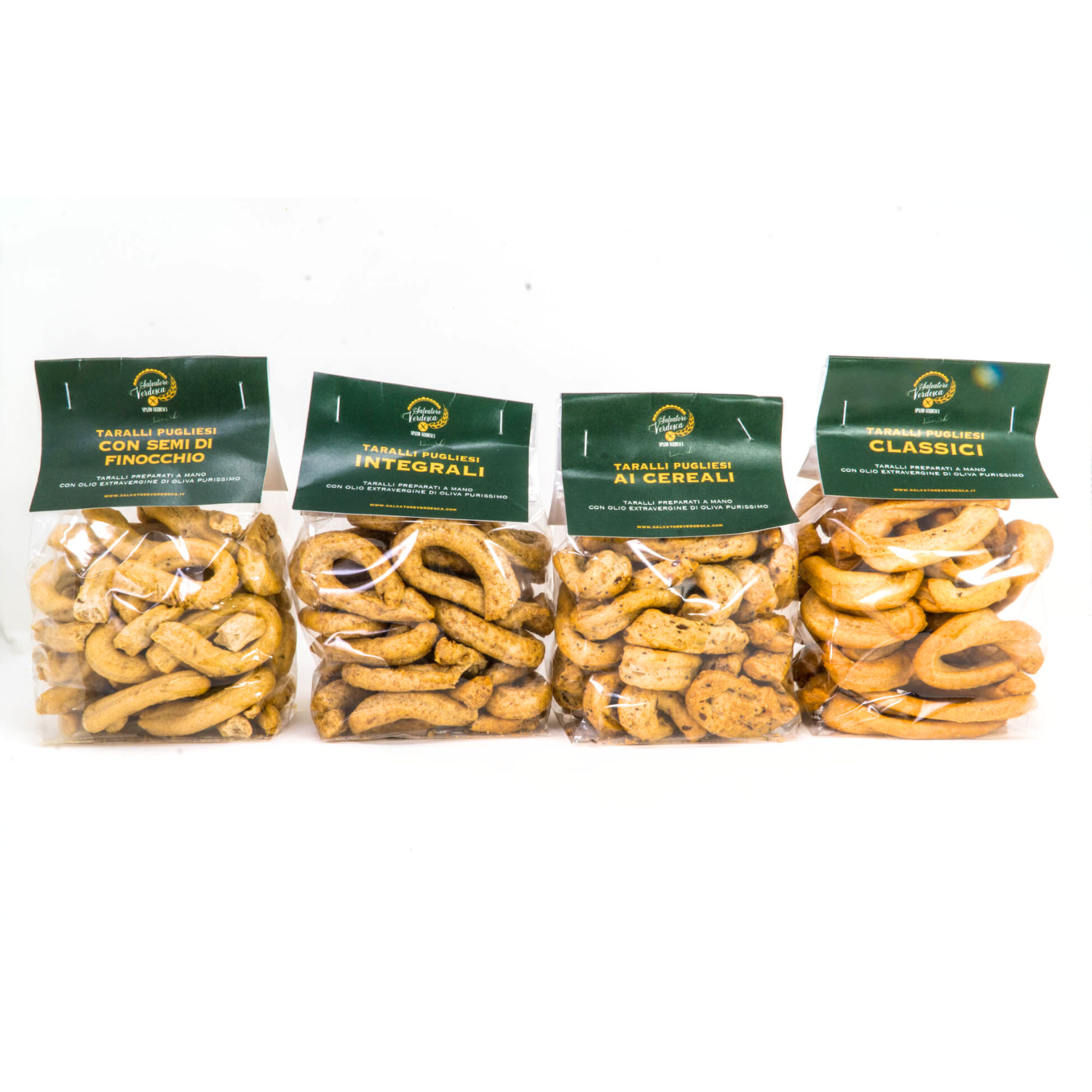 I taralli scaldati di Salvatore Verdesca nascono nella piccola bottega di Molfetta (Bari), seguendo la ricetta originale delle nonne e delle mamme pugliesi. Ogni tarallo è un piccolo capolavoro di semplicità: farina macinata a pietra, olio EVO della nostra terra e zero conservanti. La loro croccantezza e il sapore genuino ti portano direttamente nel cuore della Puglia.